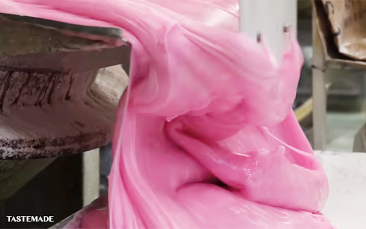 工場潜入&密着取材は、「餅粉」の大きな袋を蒸練機に投入するシーンからスタート。徐々に「さくらんぼ餅」へと成長を遂げ、最後はトラックで皆さんの元へと旅立つシーンまで、ひとつひとつの工程を丁寧に解説してくれています。