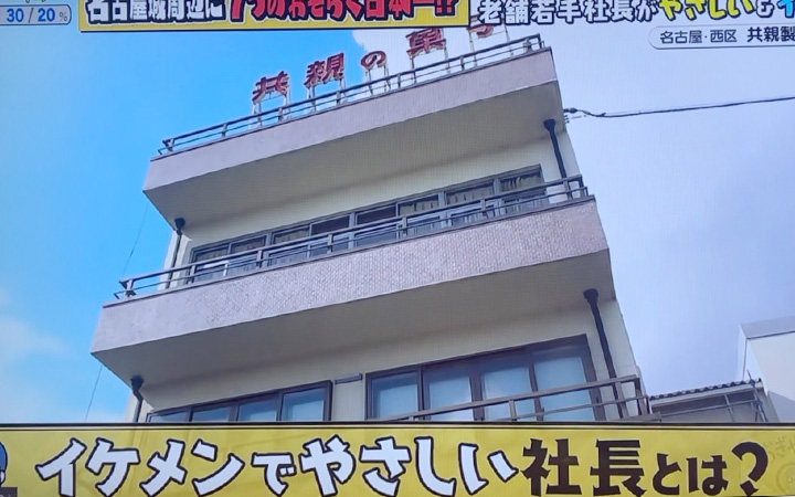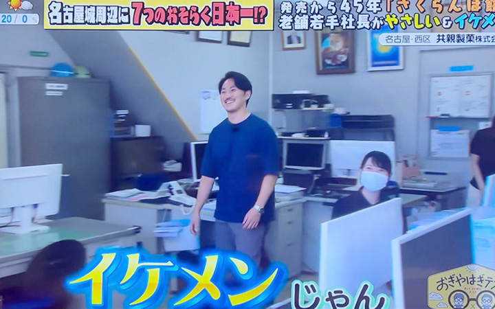 というのも、“名古屋周辺で『おそらく日本一?!やさしい&イケメン社長』がいる会社”として共親製菓を紹介されているのです。テレビ取材は何度か受けてまいりましたが、まさかこの切り口で来られるとは! おぎやはぎテラスの皆様の発想力に脱帽です。