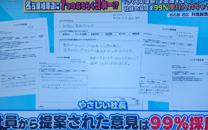 続いて「やさしさ情報」についてぐいぐい迫ってくるお2人がフォーカスしたのが「アイデア提案制度」です。こちらは従業員が現場目線で改善点や新たなアイデアを「ポスト」に入れるというもので、現在その採用率は99%!提案にはきちんと報酬も支払われます。