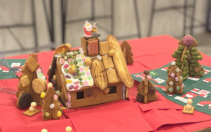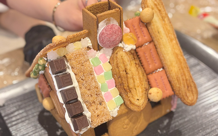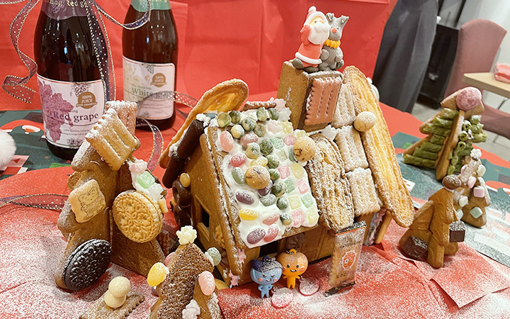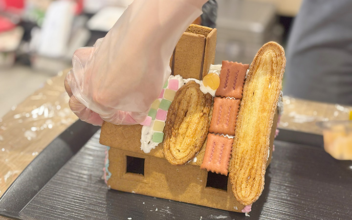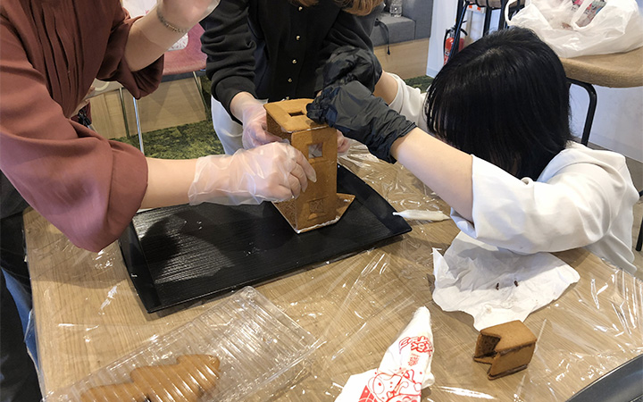 ここまで出来たら、あとはお楽しみの「デコ」タイム。家の屋根や壁を、付属のツリー型のクッキーや各社持ち寄ったお菓子でアレンジしていきます。これまたみんなでワイワイと楽しい時間でした。