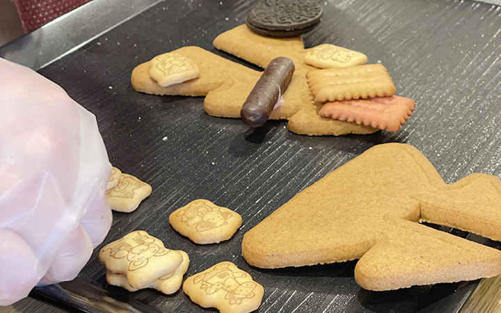 早速、ベース作りからスタートです。土台やホイップクリーム、チョコペンなどは春日井製菓さんが準備してくださり、ご厚意に甘えさせていただきました。メンバーそれぞれお菓子作りの経験者ではありますが、「家づくり」は今回が初めて。一応は勉強してきたのに、あれあれ?クッキー同士がうまく接着しません。なぜだ、なぜなんだ・・・?!